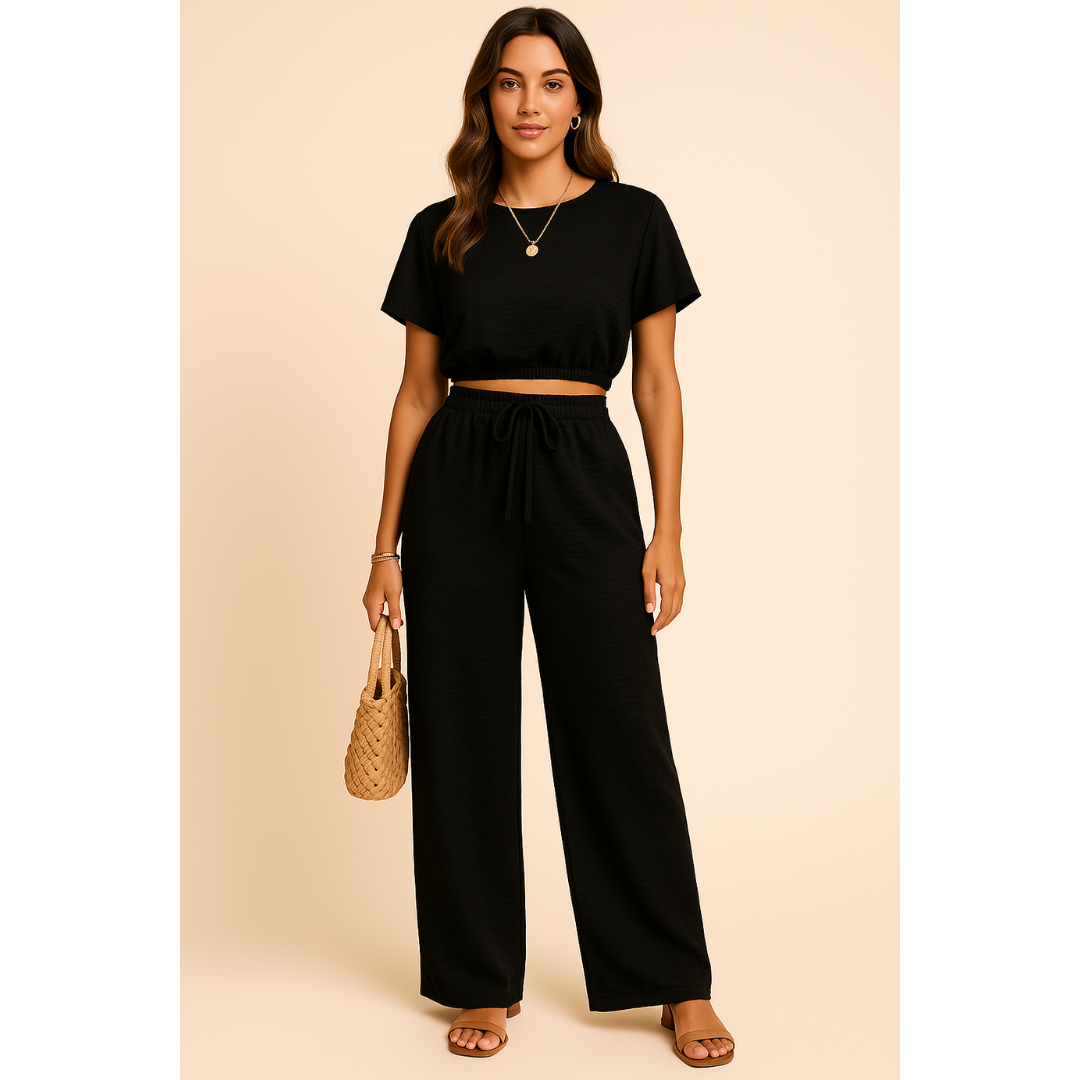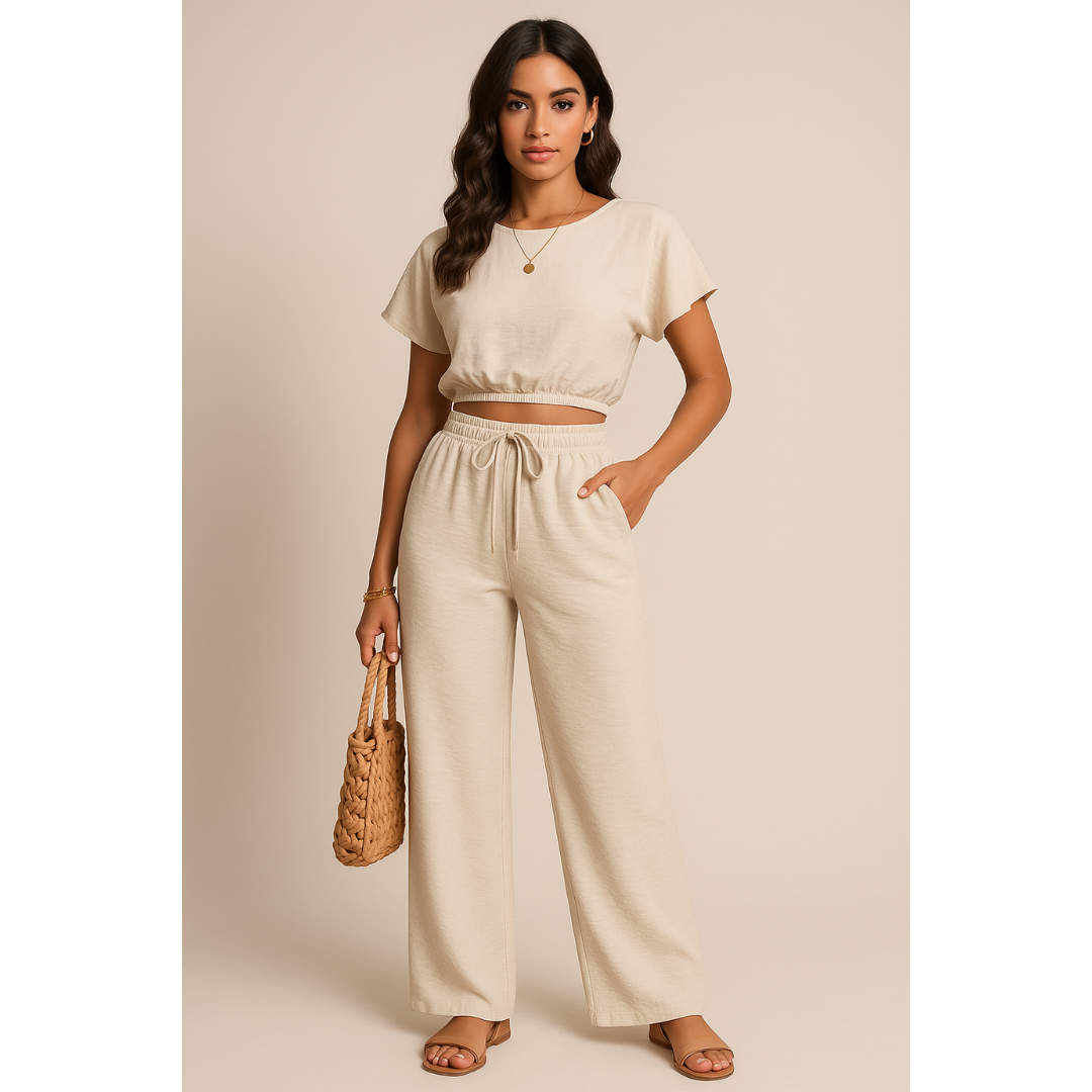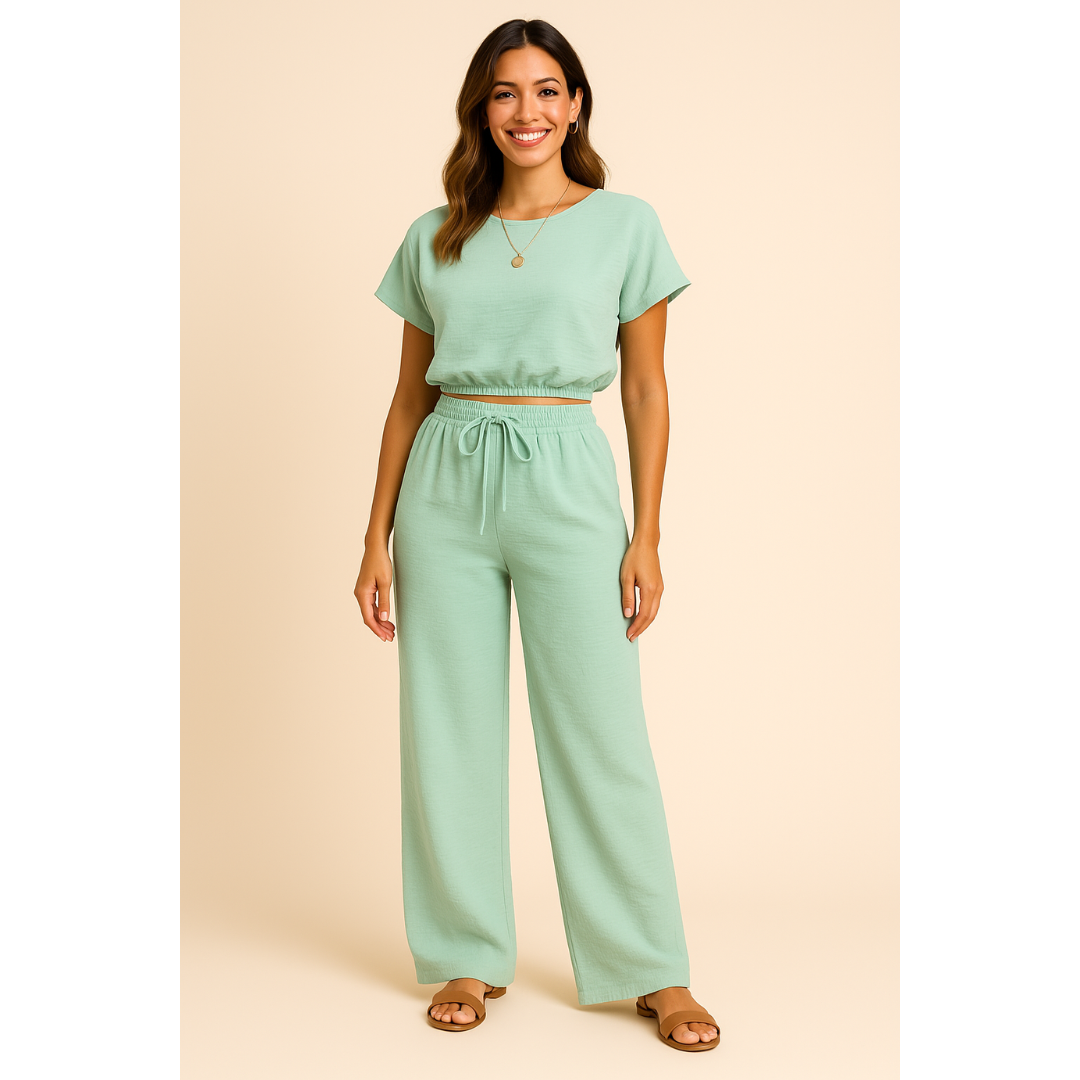 De luchtige crop top met elegante vleermuismouwen valt speels en zacht langs je huid, terwijl de bijpassende broek met trekkoord in de taille je silhouet subtiel vormgeeft. Samen vormen ze de perfecte balans tussen losjes en verfijnd – alsof ze voor jouw zomerdagen zijn gemaakt.