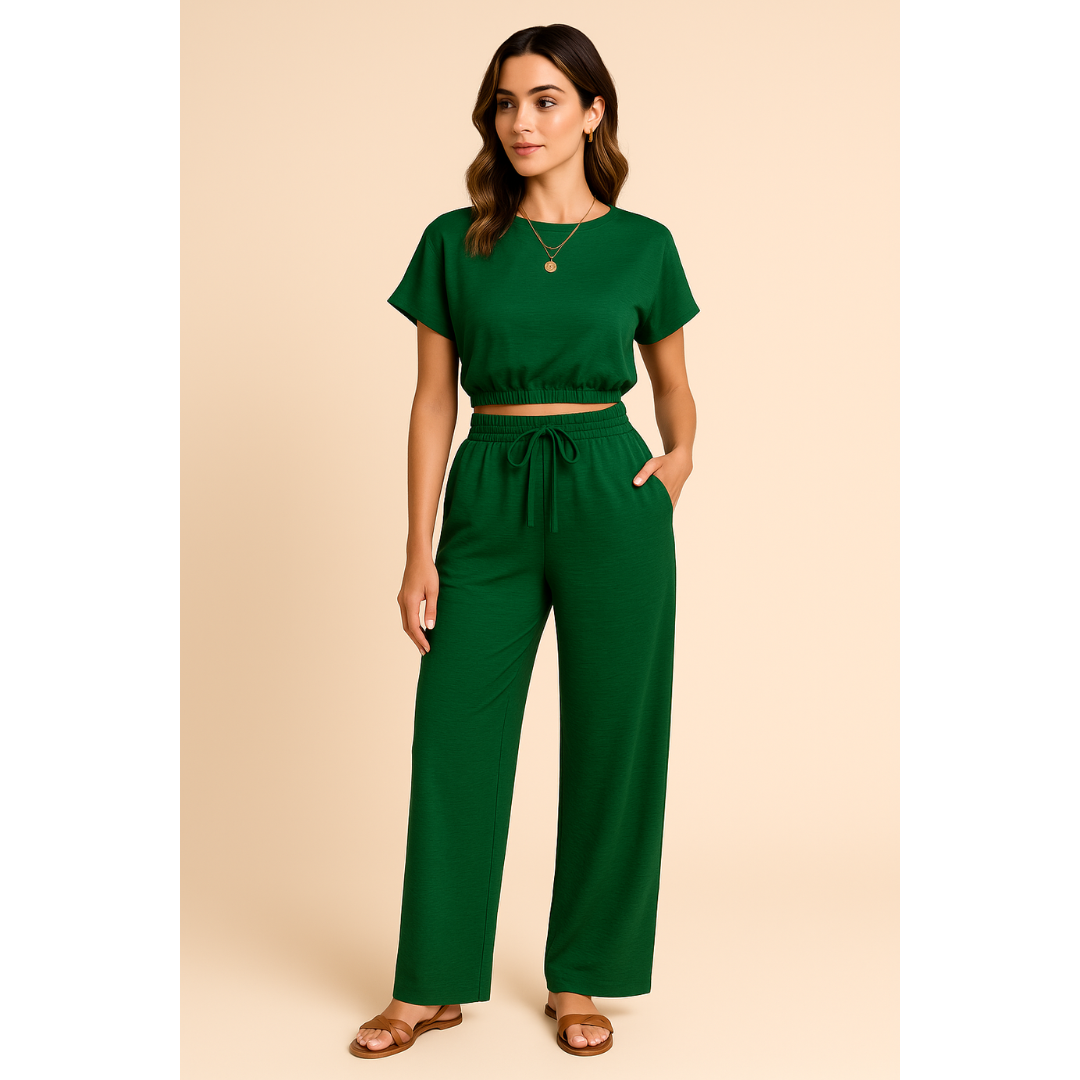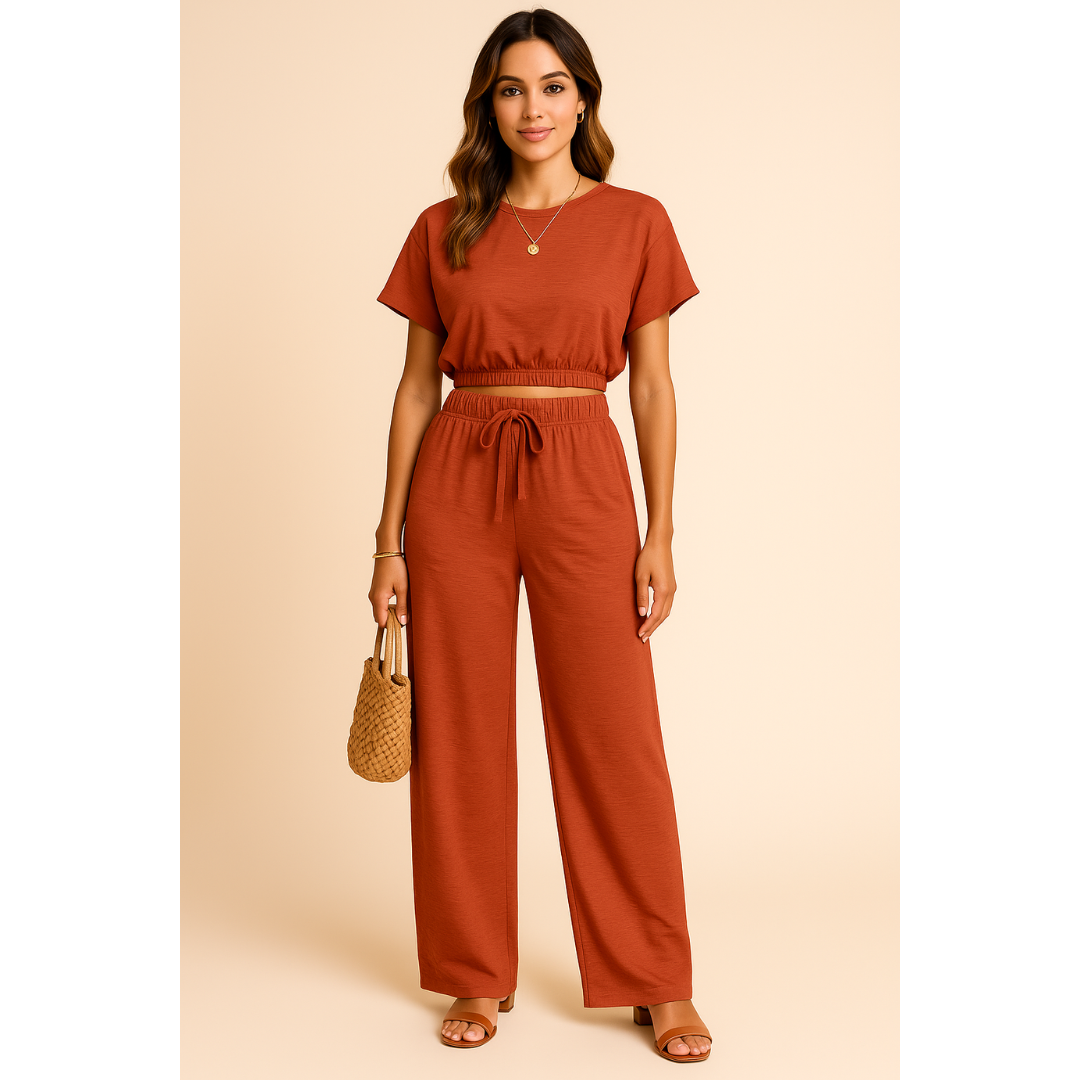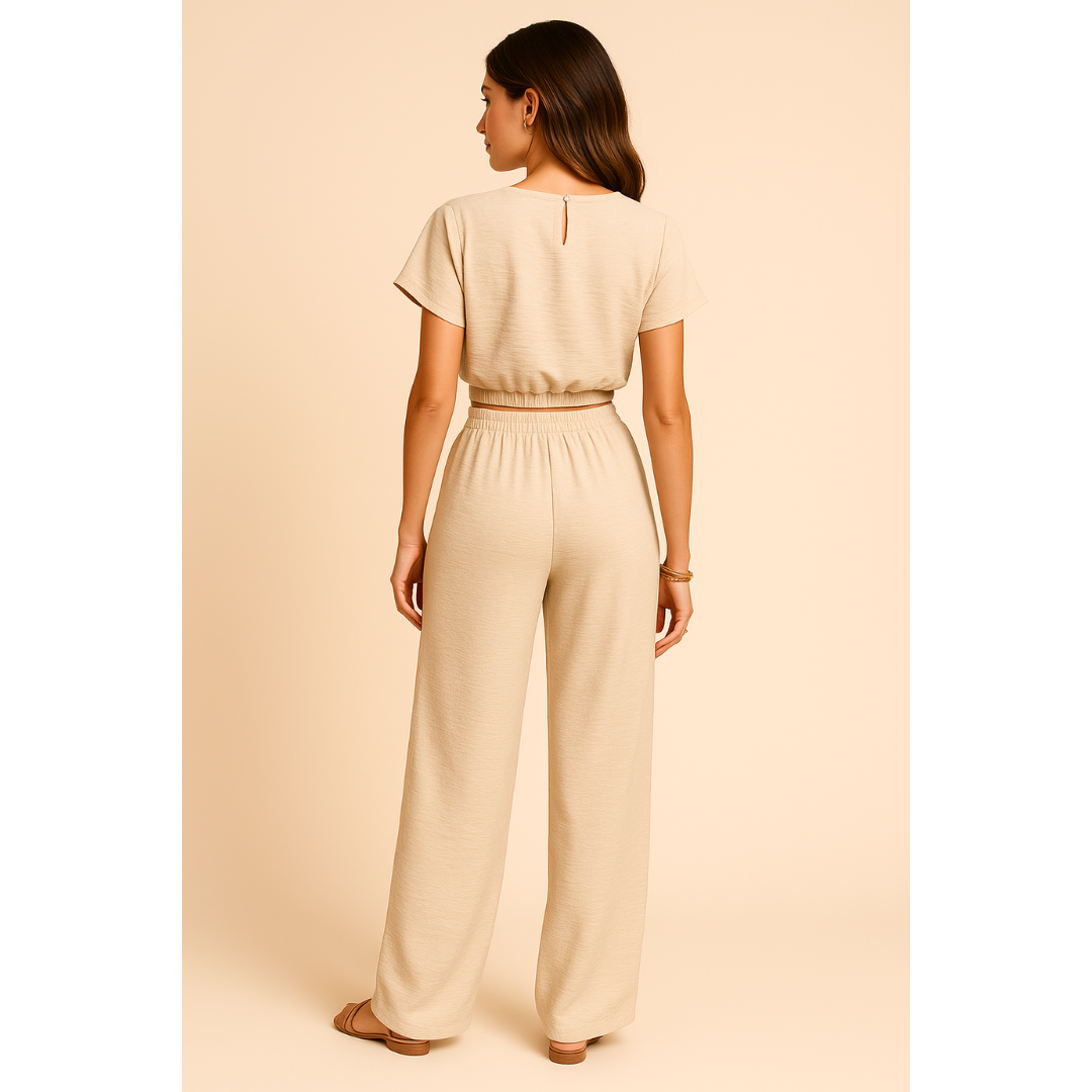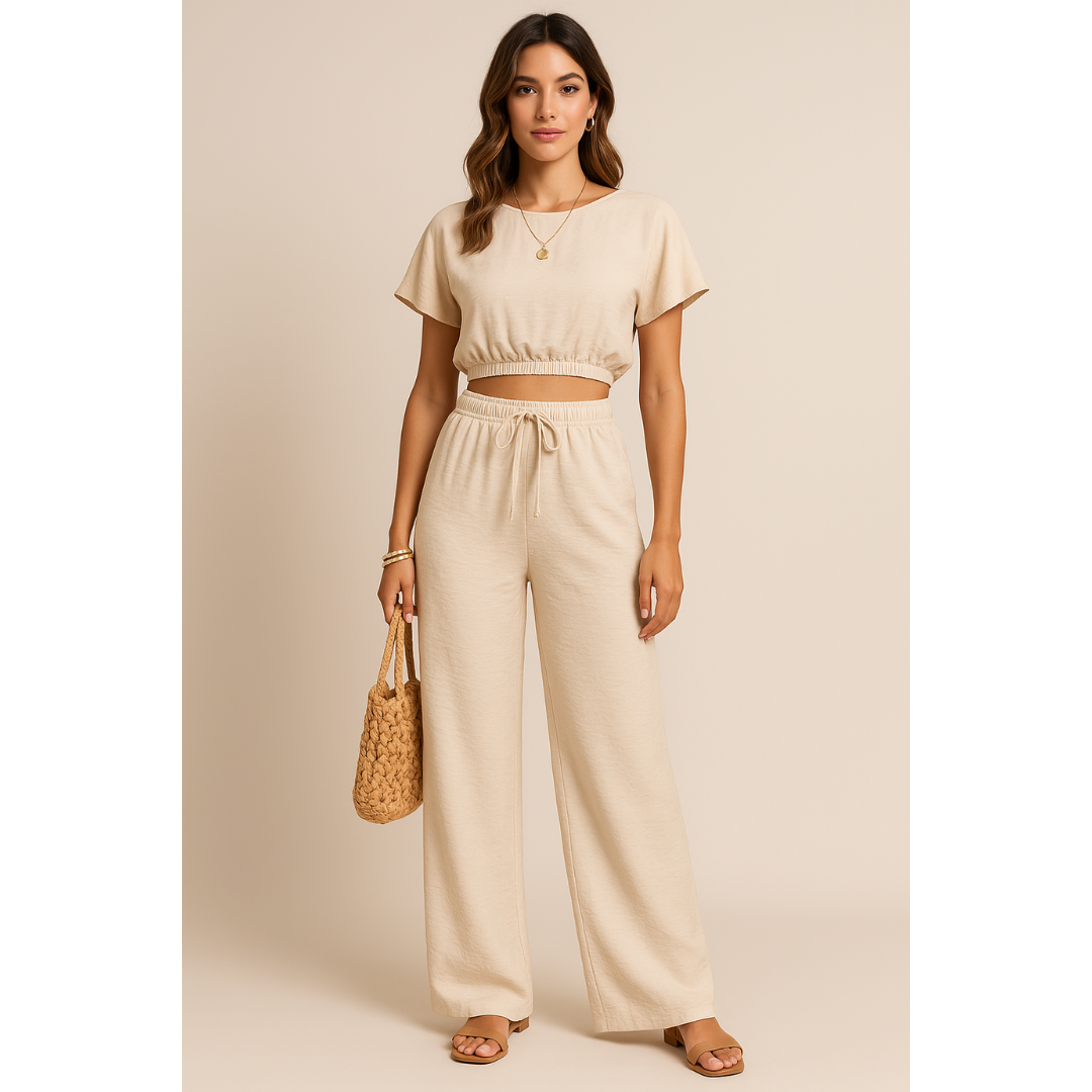 De luchtige crop top met elegante vleermuismouwen valt speels en zacht langs je huid, terwijl de bijpassende broek met trekkoord in de taille je silhouet subtiel vormgeeft. Samen vormen ze de perfecte balans tussen losjes en verfijnd – alsof ze voor jouw zomerdagen zijn gemaakt.
